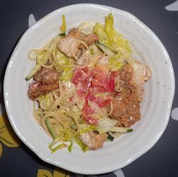 唐揚げをパスタサラダに合わせるって発想はなかったので、知った時はちょっと