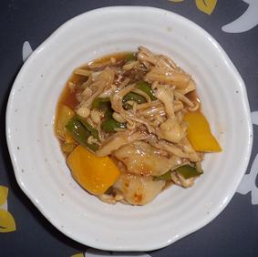 5.エノキ茸にある程度火が通ったら、ピーマン、パプリカを入れ、炒め続ける。