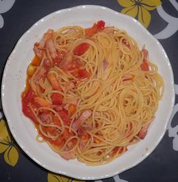 6.パスタの茹で上がり1分前になったら、残りのトマト、塩、こしょう、ケチャップを入れ、