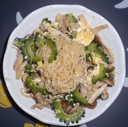 4.3.に火が通ったらゴーヤ、シメジを入れ、火が通るまで茹でる。