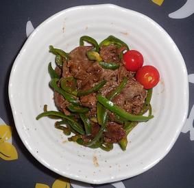 3.牛こま切れ肉に火が通ったらピーマンを入れ、軽く炒める。