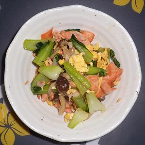 5.全体に火が通ったらチンゲン菜の葉を入れ、しんなりするまで炒める。