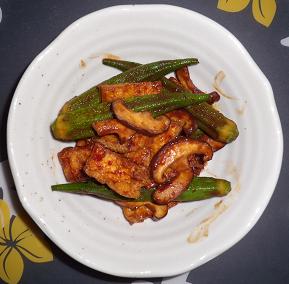 使った味噌の系統は違いますが、豚肉とレンコンの炒め煮でオクラと味噌の相性が良いと