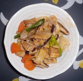 3.2.に軽く火が通ったら、レンコン、ニンジンを入れ、軽く炒める。