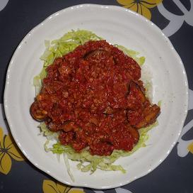 6.お皿にご飯0.5合、千切りにしたレタス(ともに分量外)を盛り、その上からミートソースをかけて完成。